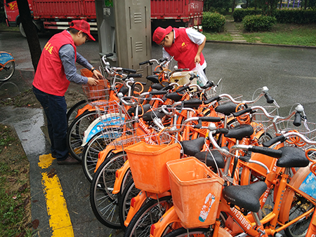 蒙蒙細雨帶著絲絲秋涼,但淋不滅志愿者們的高漲熱情。大家帶著抹布等工具,二人一組來到公共自行車服務點。有的仔細檢查每一輛公共自行車車況,認真清理車籃內的雜物垃圾,清除車架上的“牛皮癬”廣告;有的搬離占用鎖止點車位的外來車輛,報修故障車輛和鎖止器;有的擦拭干凈公共自行車坐墊、把手上的污漬。大家在細雨中忙的熱火朝天。經過近2個小時的努力,志愿者們清理了12個自行車服務點,共檢查維護公共自行車260余輛。志愿者們通過自己的行動擦亮了城市窗口,給選擇綠色出行的人們更好的騎行體驗,讓更多的人選擇公共自行車出行。